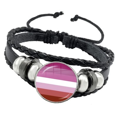 Bracelet en cuir et verre avec drapeau lesbien.