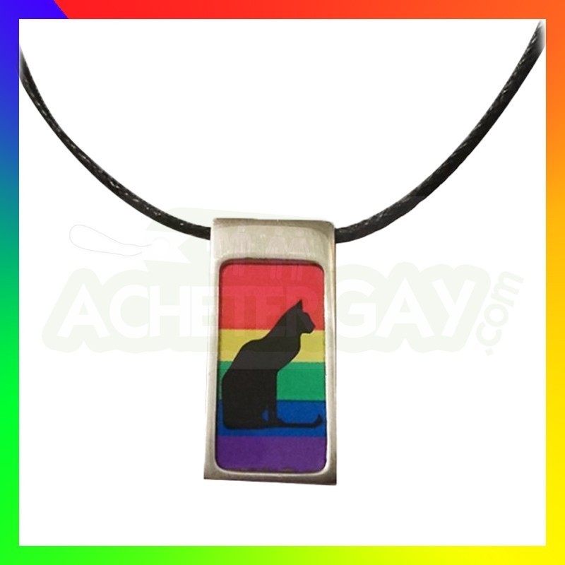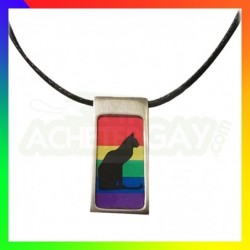 Pendentif composé d'acier inoxydable émmaillé aux couleurs du drapeau gay en forme de chat.