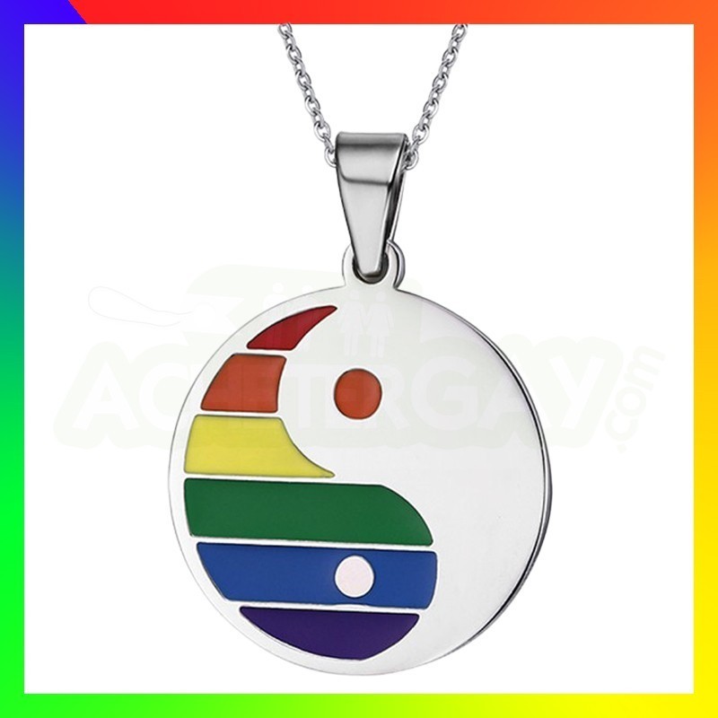 Pendentif en acier inoxydable reprenant le drapeau gay sur le principe du Ying & du Yang.
