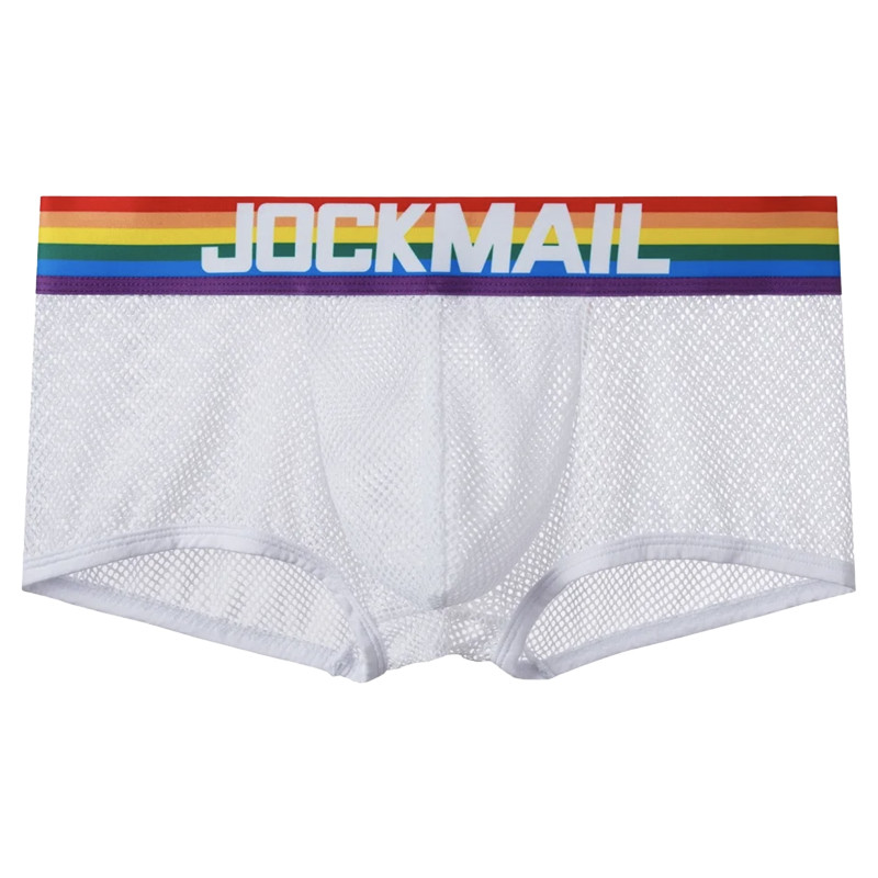 Découvre le boxer filet de la marque Jockmail. Sa matière en maille transparente est conçue pour laisser respirer la peau, tout en offrant une touche de sensualité. Sa taille élastique, ornée des couleurs de l'arc-en-ciel et du logo JOCKMAIL, assure un maintien parfait et ajoute une note de fierté subtile.