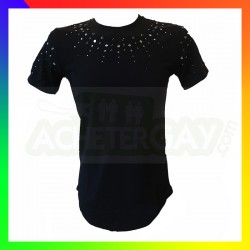 Tee shirt recouvert de strass au niveau du col est des épaules, strass noirs et argents